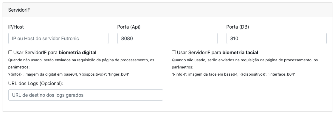 Notas: A versão mínima do desktopif (catracas Style: Bio, Bio-Face, Bio-Qr) para usar as configurações abaixo é a 3.1.38 As definições para não usar o ServidorIF são feitas nas configurações avançadas da catraca. http://ipcatraca/config/adv